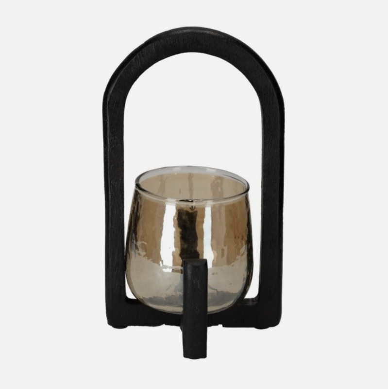 Deze stijlvolle lantaarn heeft door de combinatie van het gebogen houten frame en het warm getinte glas een rustieke uitstraling die past in moderne en landelijke interieurs. Door de unieke afwerking van het glas wordt het kaarslicht op sfeervolle wijze verspreidt door de ruimte.